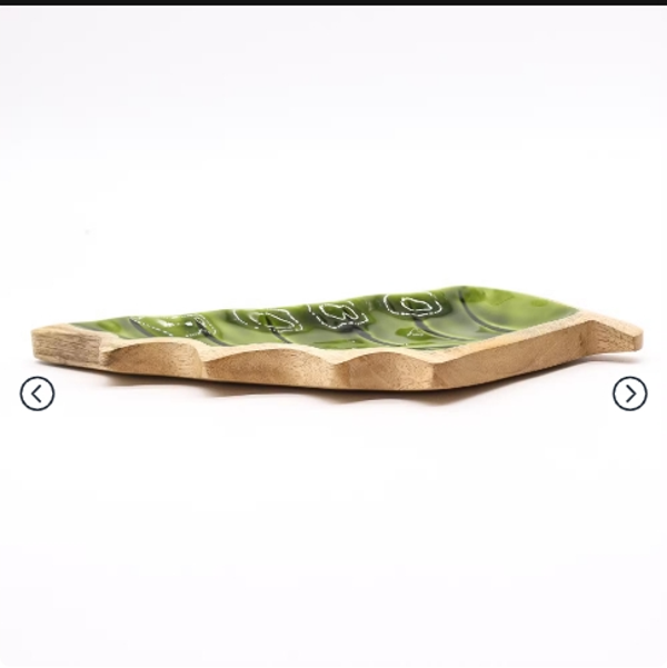 Bring the charm of nature into your home with this stylish leaf-shaped wooden bowl. Made from sustainable mango wood and featuring a glossy green enamel interior, it adds a hint of woodland elegance to any setting.