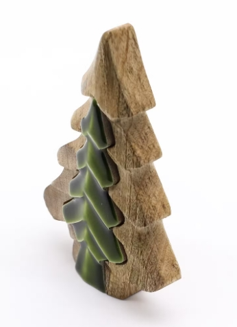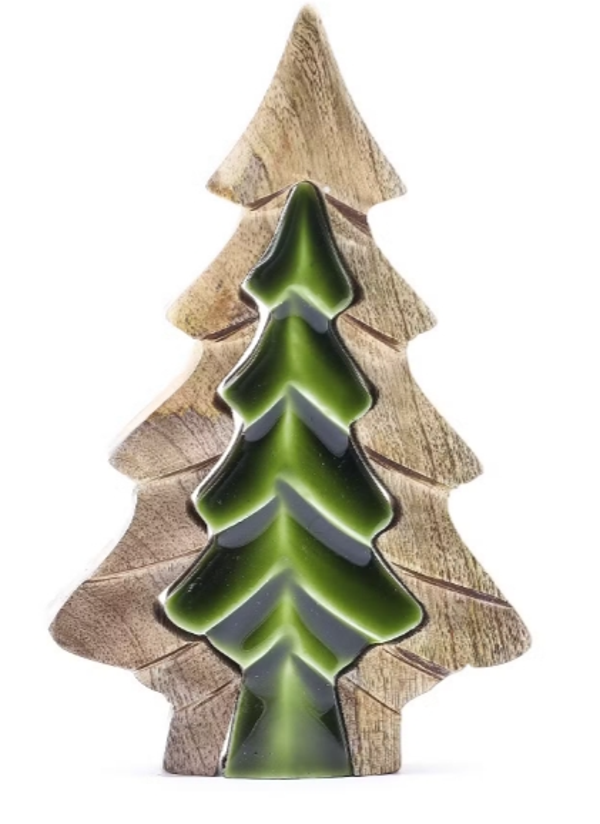 Made in India | Mango Wood & Enamel | Approx. 15x10cm Add a touch of woodland charm to your home with this Small Tree in a Tree ornament from the Lost in the Forest collection. Crafted by hand in India using natural mango wood, it features a glossy green enamel inlay. The layered pine tree design beautifully combines rustic texture with vibrant detail.
